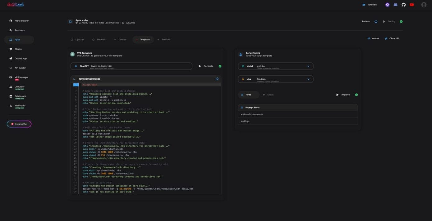What if deploying an app was as easy as describing it in plain English? With ChatGPT integration, you can now generate deployment scripts just by explaining what you need. Instead of searching for complex configuration files, simply tell ChatGPT your requirements, and it will create the perfect Bash template for your setup.