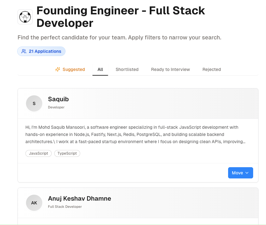 The fast profile viewer enables rapid navigation between candidates without losing context or switching windows, making it feasible to review dozens of portfolio-backed applications in the time traditional resume screening takes for just a handful. Every team member sees the same real-time pipeline, eliminating confusion about who’s responsible for next steps and where each candidate stands in the process.